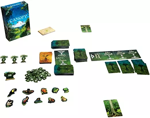 Canopy is een spel voor 1-4, waarin spelers strijden om het meest overvloedige regenwoud te laten groeien. Het jungle-ecosysteem zit vol symbiose en spelers moeten hoge bomen en weelderige jungleplanten laten groeien om de meest uiteenlopende dieren in het wild aan te trekken. Door zorgvuldig te selecteren wat er in uw bos groeit, kunt u de ideale balans tussen flora en fauna creëren en een bloeiend ecosysteem creëren.