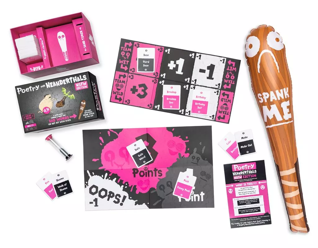 Poetry for Neanderthals: NSFW Edition is an adult party game similar to Taboo® where players earn points by getting their teammates to guess words and phrases. The catch is that they are only allowed to use single-syllable words. Enjoy getting grandma to guess phrases like “nudist beach,” “mile high club” or “banana hammock,” but be careful. If you use any words with more than one syllable, the other team gets to spank you with the 2-foot inflatable Spank Stick. But maybe that’s not such a bad thing?