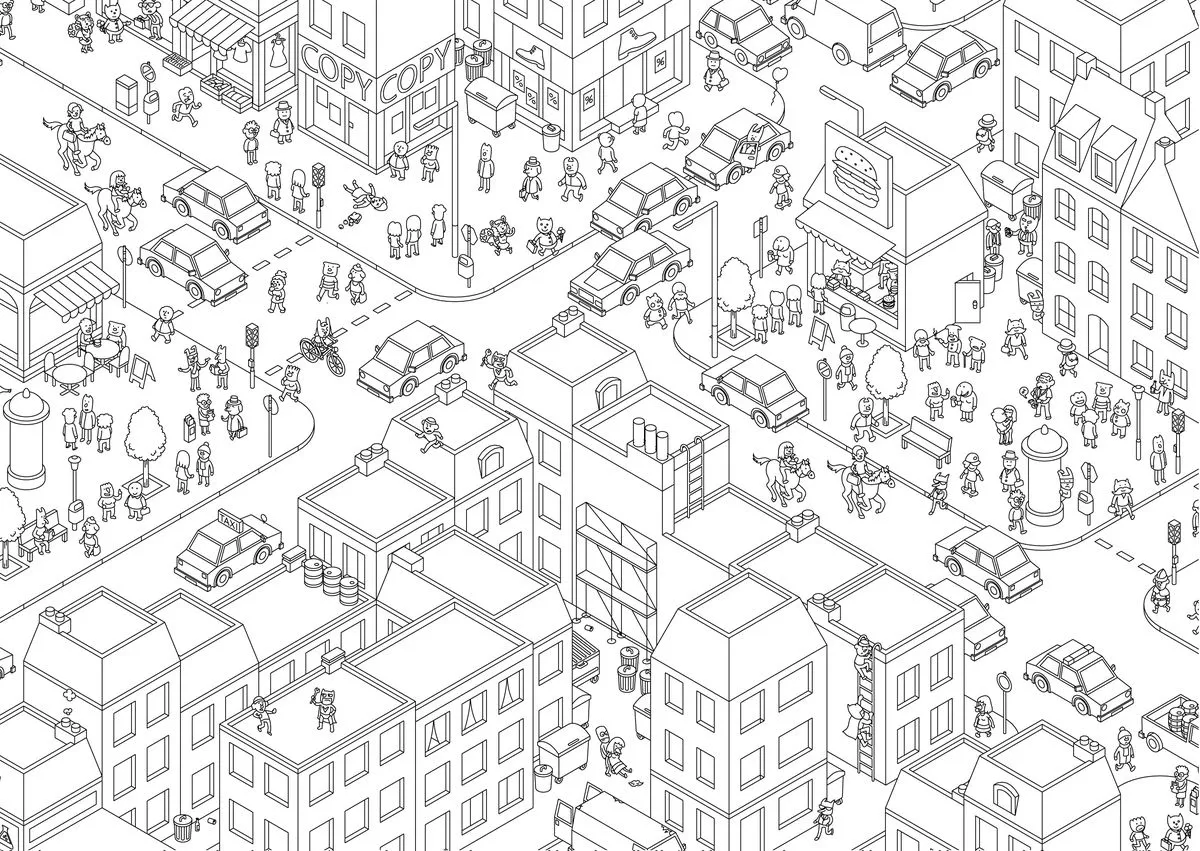 Welcome to Crime City, a city where crime lurks around every corner. Disatrous secrets, devious robberies and cold-blooded murders are the order of the day here. The local police are no longer able to control the situation. Therefore, the work of clever investigators is required. MicroMacro – Crime City is a cooperative detective game. Together, the players solve tricky criminal cases by determining motives, finding evidence and convicting the perpetrators. An attentive eye is just as important as a deductive talent in order to unravel everything riddle on the large game board. A magnifying glass is included in the game to help with finding every detail. How does it work? • One player takes on the role of Lead Investigator and is responsible for reading the case cards out loud (but of course they will also help with solving the case). • The players choose together which case they want to play and the Lead Investigator reads out the corresponding start card as well as the first task. • Together, the players explore the map of Crime City in order to answer all the questions on the case cards, one after another.