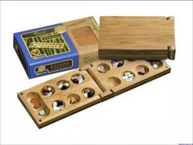 Het bekende Kalaha, met een setje halfedelstenen, in eco-vriendelijke bamboe uitvoering. 16 x 10 x 3 cm.