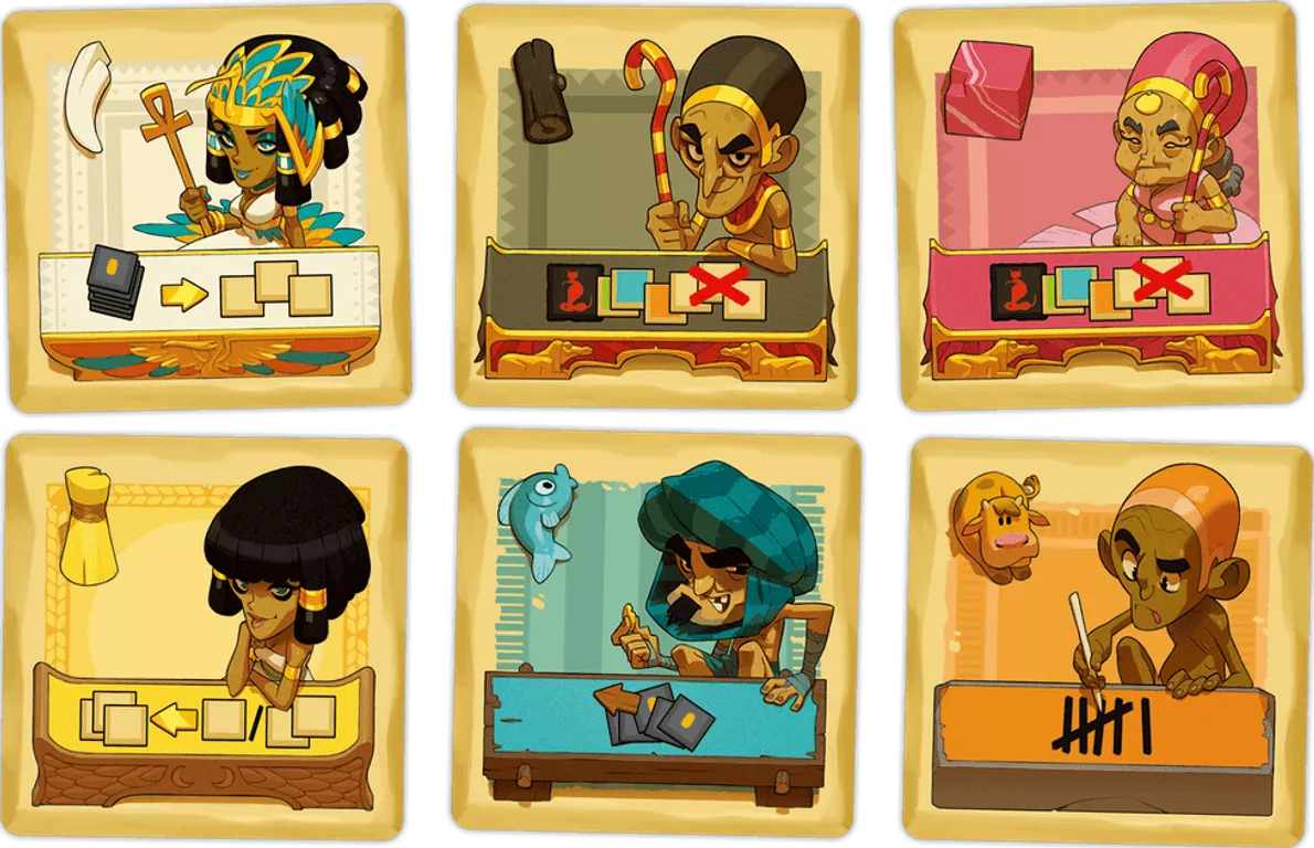 Als hij genoeg heeft, kan de speler een set van minimaal 3 tegels van hetzelfde type verkopen. Deze tegels zullen hem overwinningspunten opleveren aan het einde van het spel, afhankelijk van hun aantal en het aantal Scarabs dat ze presenteren. Maar spelers kunnen ook rekenen op de krachtige krachten van Characters om de trend te keren.